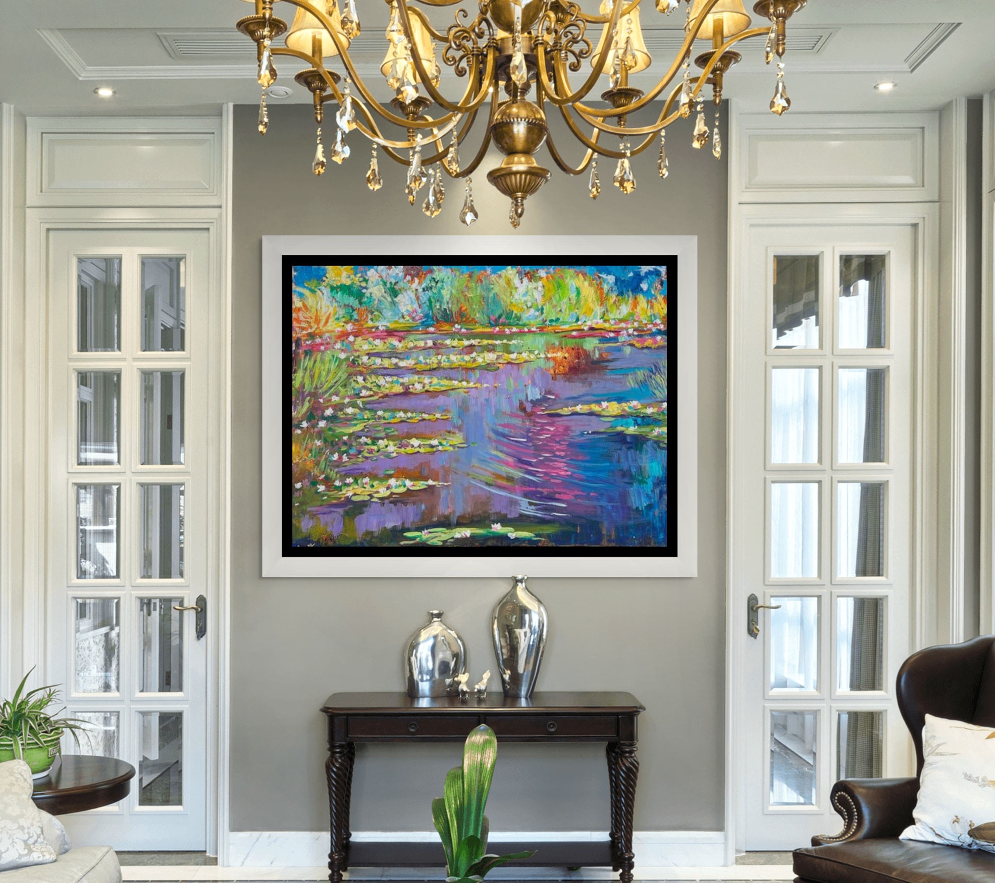 This Monet inspired piece is a vibrant impressionistic painting depicting a serene water garden scene. The surface of the water is adorned with numerous lily pads and small white flowers. The reflection of colorful foliage in the water creates a dynamic interplay of blues, pinks, and purples. The surrounding lush greenery in bright oranges, greens, and yellows conveys a lively and harmonious natural environment. The bold, expressive brushstrokes enhance the sense of movement and light throughout the composition