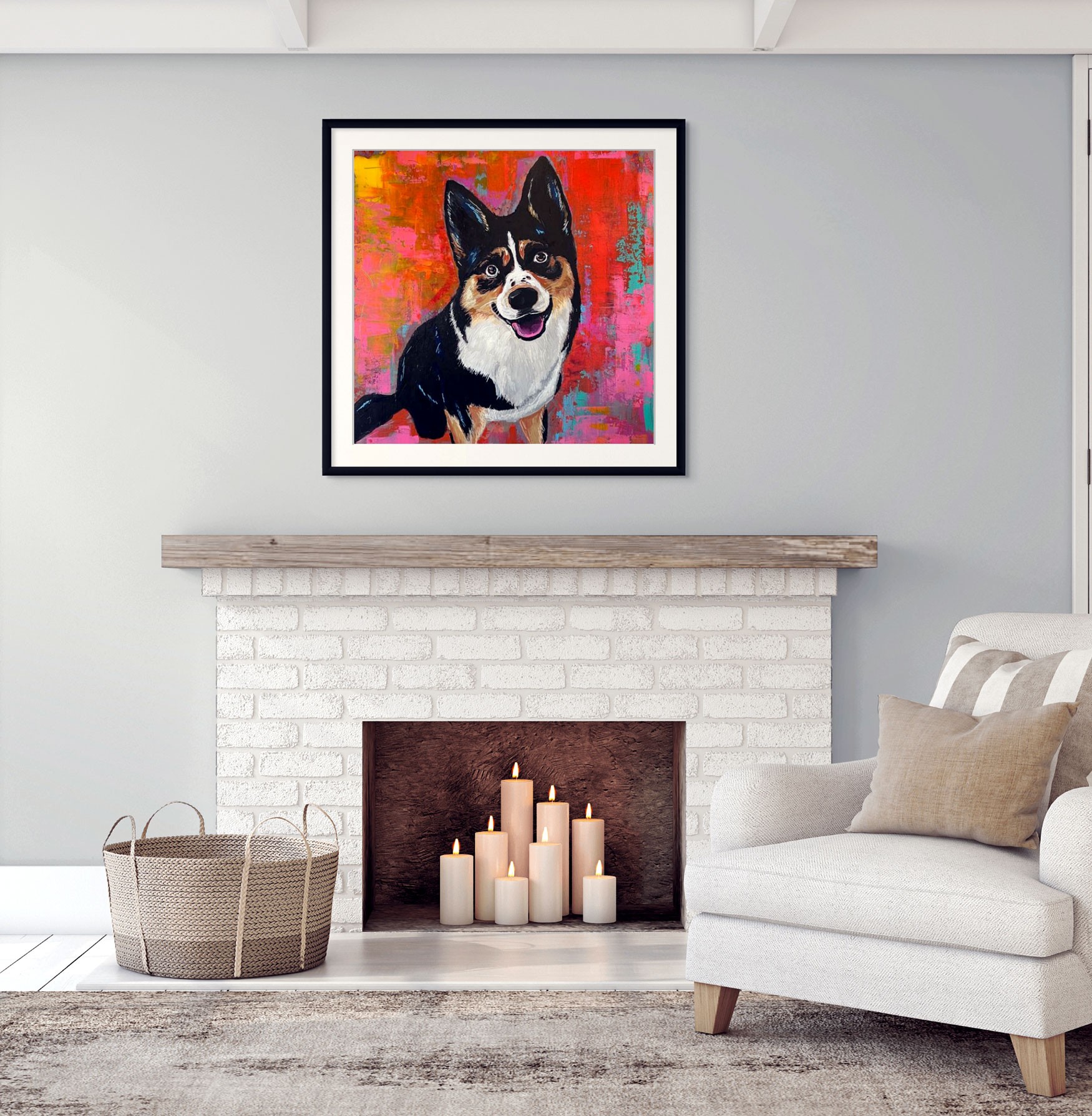 The artwork is a vibrant painting of a dog with a joyful expression. The dog is depicted with a black, white, and tan coat against a colorful, abstract background consisting of bright pinks, oranges, and yellows. The lively brushstrokes and bold colors give the piece an energetic and playful feel, highlighting the cheerful demeanor of the dog.