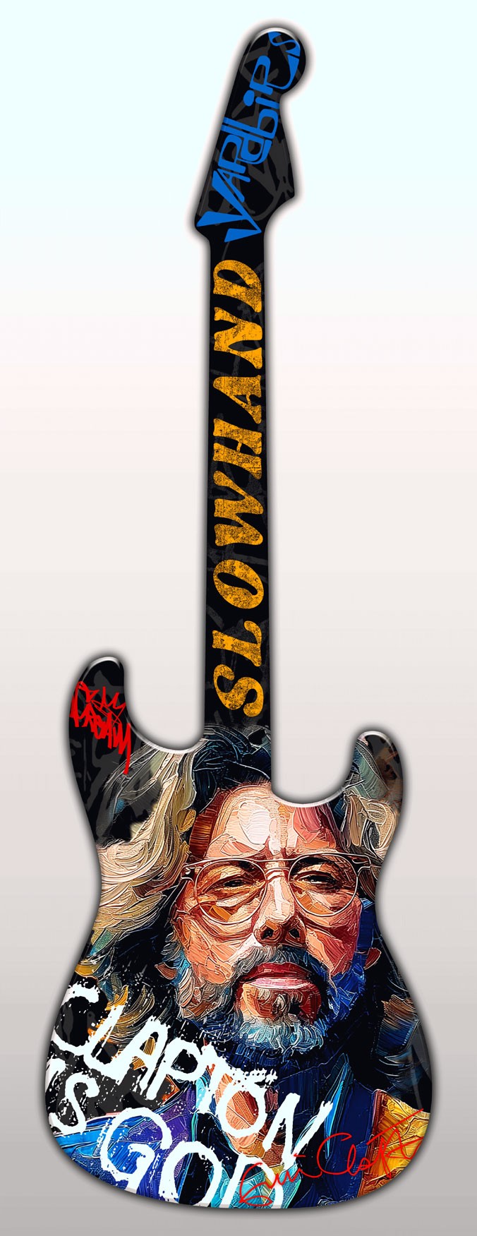 The stylized guitar design featuring a detailed portrait of a Eric Clapton. The body's surface includes prominent, colorful text. The word 'SLOWHAND' is vertically displayed on the neck. The artwork combines vibrant colors and textures to create a visually striking image on the guitar-shaped "canvas"
